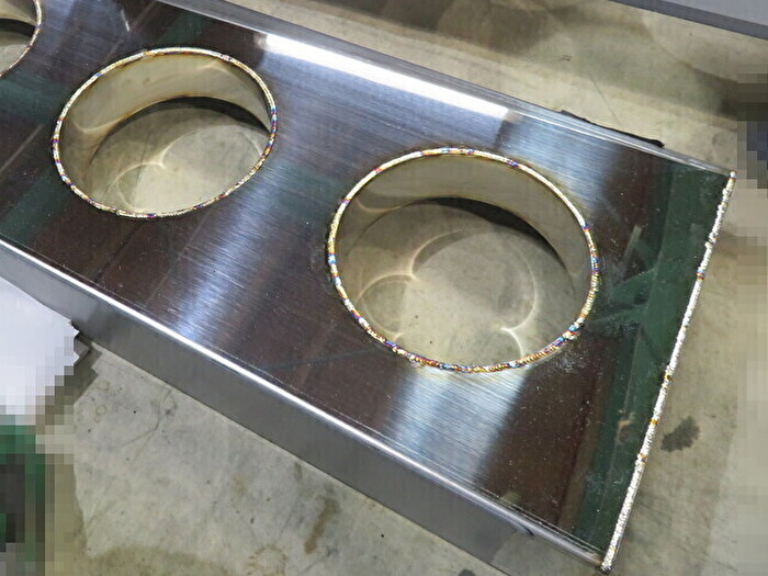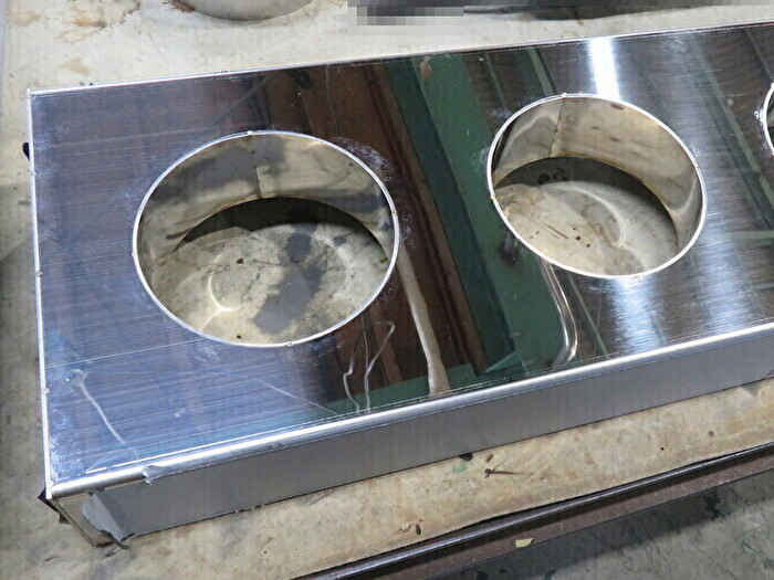 ステンレス門構をくり抜き加工し、テールボックス、ターミナルゴムを取り付けます。