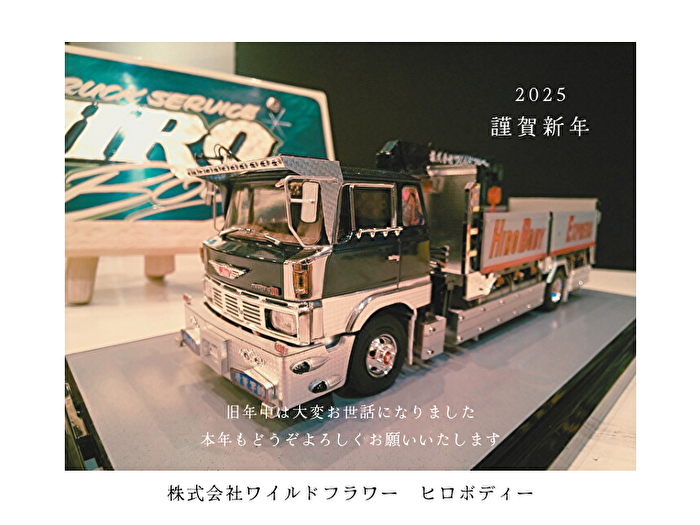 HOME > Diary > Diary 2025年スタート☆ 投稿日:2025-01-06 明けましておめでとうございます。 ヒロボディーのHIROMIです(*´˘`*) 雨が降るとても寒い日の本日、2025年の営業がスタートしました! 昨年は当店をご愛顧いただき誠にありがとうございました。 新たな一年の始まり。 みなさまに笑顔と幸せが満ちる年になりますように。 本年もどうぞよろしくお願い致します。 シェア -Diary -2025年スタート, SD, いすゞのトラック, エルフ, デコトラ, トラック架装, ナンバープレート, ヒロボディー, ピンストライプ, プラモデル, ボディー制作, ボディー架装, レタリング, 新年のご挨拶, 日野レンジャー, 日野レンジャーSD, 株式会社ワイルドフラワー